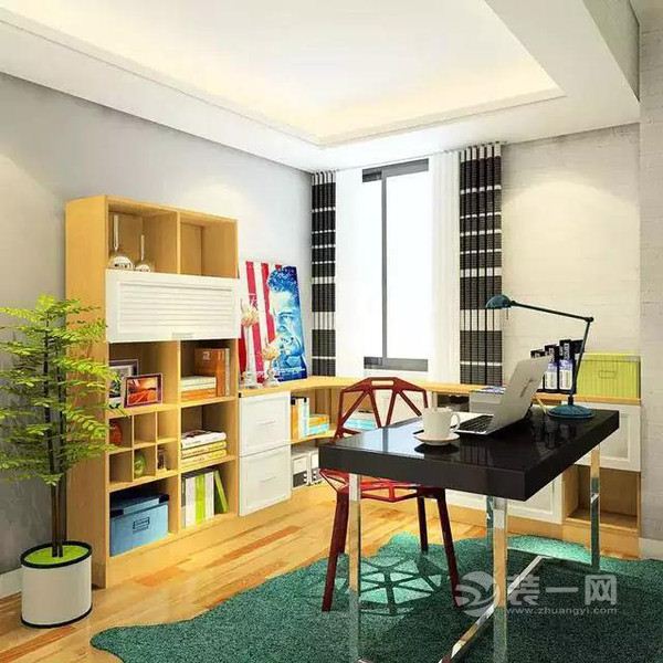 方案一 行使客餐厅的拐角与飘窗处 简易定制一套书柜 书桌呈开放式摆放 如许既行使了空间 又能增长客餐厅规划的雄厚程度。